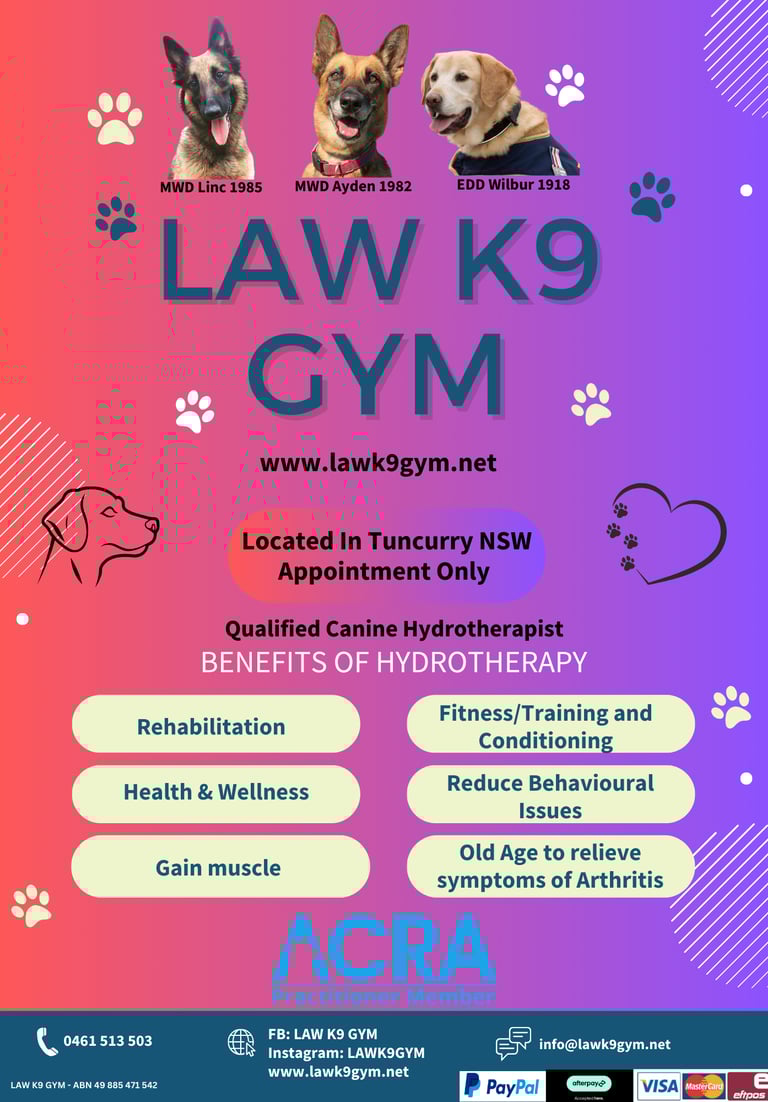 Cash, Eftpos Facilities and Afterpay Available at LAW K9 GYM.